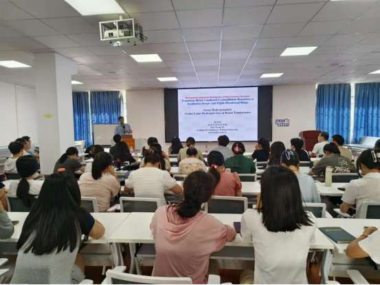 余志祥教授的报告题目为“成环反应的发展/应用/机理研究以及常温常压下芳环氢化反应的发现”,主要介绍了有机全合成中的[5+2+1],[4+2+1]和[4+1]成环反应以及常温常压下芳环的氢化反应,对这些反应的发展和部分应用进行了讲解,并对反应的机理研究进行了简单介绍。在报告的最后,在场老师、同学都积极提问,现场学术氛围十分热烈。