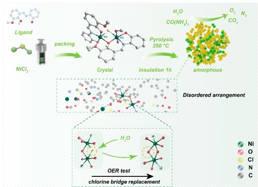 针对这一难题,彭旭副教授创新性地提出“氯桥配位调控策略”,设计了一种含μ2-Cl桥的双核镍配合物前驱体[Ni2(μ2-Cl)(HL)2(CH3OH)(H2O)Cl],并通过低温热解成功制备出高稳定性的非晶催化剂(a-250-I)。该策略通过氯桥稳定前驱体的局部配位环境,在其非晶化过程中有效保留短程有序结构,并在电催化过程中实现μ2-Cl桥向μ2-O桥的动态转变。实验表明,该催化剂在10 mA·cm-2电流密度下,氧析出反应(OER)和尿素氧化反应(UOR)的过电位分别低至1.47 V和1.36 V,且具备优异的双功能催化稳定性。理论计算进一步揭示,氧桥取代通过调节镍的d轨道能级,优化反应中间体的吸附能垒,显著提升电子转移动力学,为高性能非晶催化剂的设计提供了新思路。