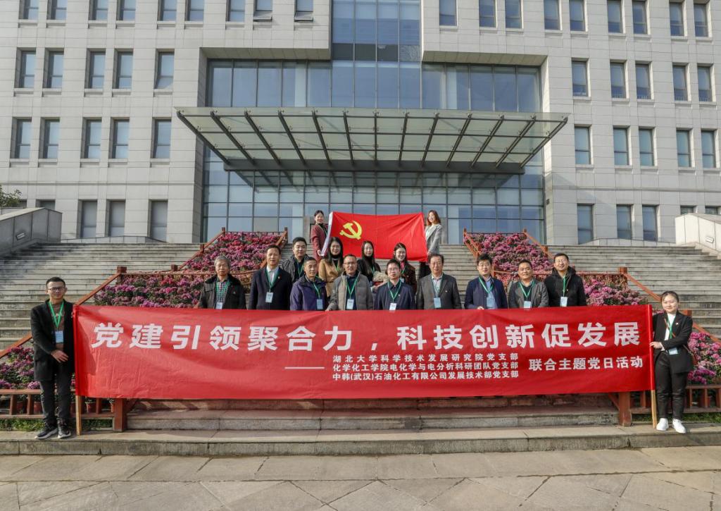 为响应和贯彻国家和湖北省关于加快推动科技服务业发展政策,围绕支撑创新驱动发展战略实施目标,加大科技服务供给,2021年12月10日上午,bat365中文官方网站科学技术发展研究院党支部联合bat365中文官方网站电化学与电分析科研团队党支部共同走进中韩(武汉)石油化工有限公司,校企联合开展“党建引领聚合力,科技创新促发展”主题党日活动。校党委常委、副校长艾青松以普通党员身份,参加了此次活动。
