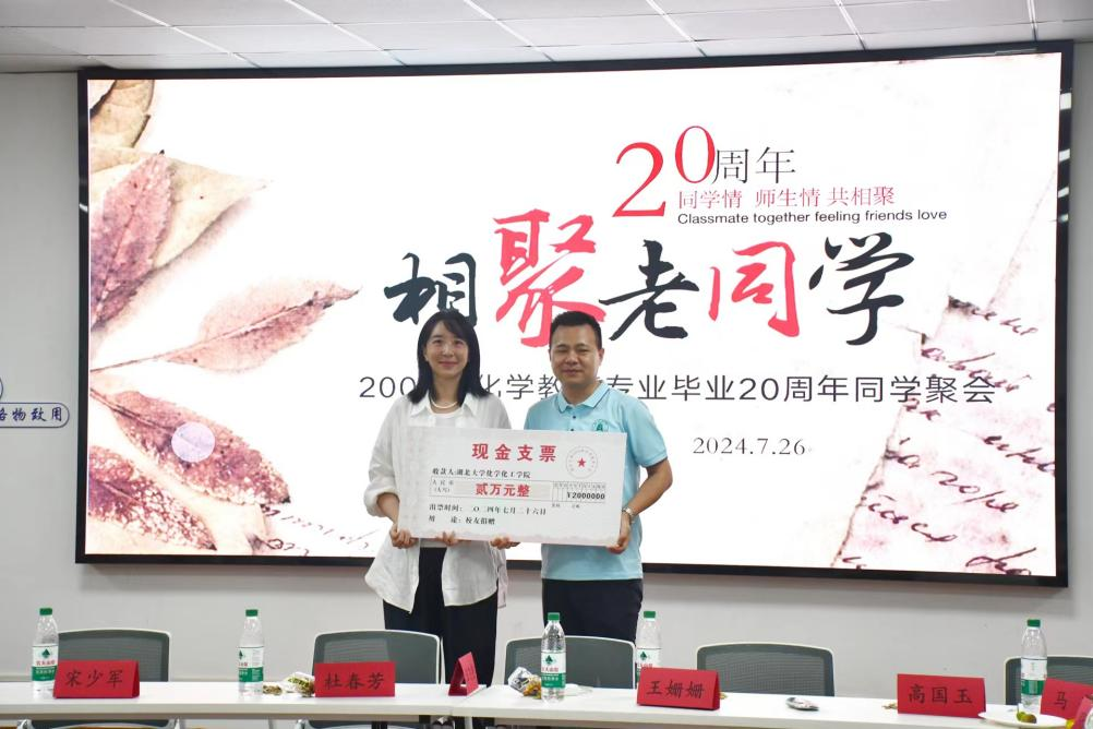 自由交流环节,在场的每位校友和老师都积极发言,分享人生成长感悟,回忆往昔峥嵘岁月,谈笑间皆是同窗情谊和感念师恩,座谈会临近结束,校友们向各位恩师赠送礼物,并举行了捐赠仪式,班长涂文君代表2000级化教全体校友,向bat365中文官方网站捐赠贰万元现金,对学院的建设发展聊表支持;学院副书记刘莹老师代表学院接受捐赠,并对校友们的善举表示感谢;最后,一张张珍贵的师生合影,定格了这段美好时光。